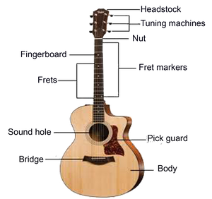 Sebelum belajar lebih lanjut cara memainkan gitar, ada baiknya mengenal terlebih dahulu tentang seluk beluk gitar. Berikut ini adalah bagian dari gitar :